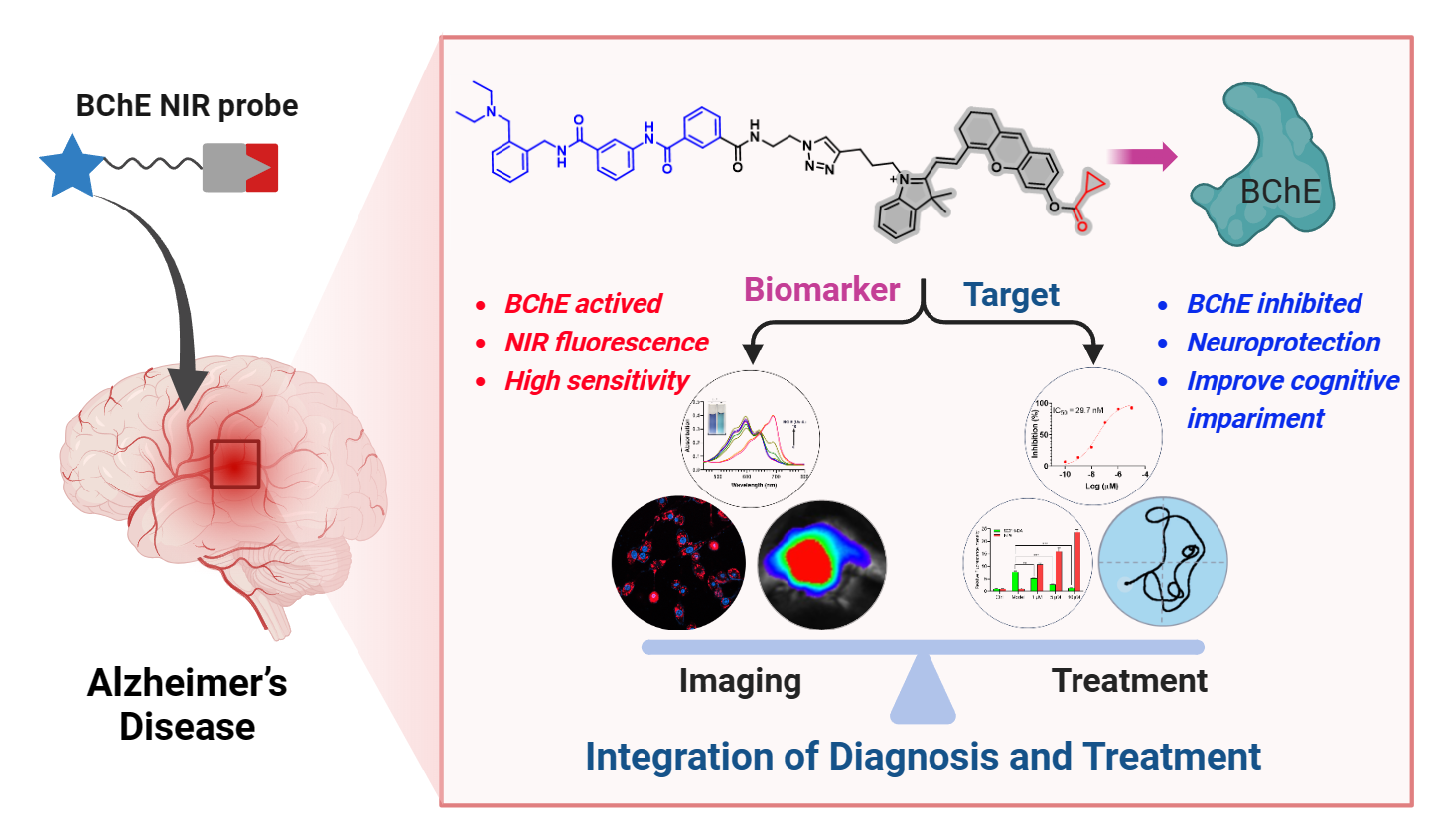 丁酰胆碱酯酶(BChE)是阿尔茨海默症(AD)的一种有前途的生物标志物和有效治疗靶点。基于该课题组前期在小分子BChE抑制剂的研究基础之上(J. Med. Chem. 2022, 65, 11365-11387),设计合成了一种新的BChE激活的近红外探针DTNP,它可以被BChE选择性激活并抑制其酶活性。DTNP在结构上由三部分组成:环丙烷部分作为识别单元,NIR荧光团半花菁衍生物作为NIR荧光基团,N-苄基苯甲酰胺类BChE抑制剂作为治疗单元组成。DTNP以高灵敏度特异性结合BChE,并表现出强烈的“开-关”近红外荧光和神经细胞保护。体内成像显示,DTNP具有良好的血脑屏障通透性和长期跟踪能力,初步具备AD诊断能力。此外,该探针可以显著抑制BChE活性,促进ACh的释放,改善学习缺陷和认知障碍。总之,DTNP是第一个报道和验证的用于检测AD中BChE的治疗诊断双功能探针,可能为AD的成像和治疗提供基础和灵感。