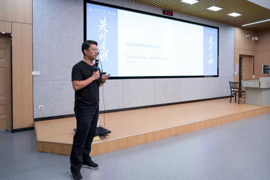 王青松总裁带来了题为“从药剂学到新药BIOTCH”的讲座。他分享了药剂学难忘的求学经历与创立公司致力于新药研发的创业历程,介绍了药物制剂各岗位的工作职责,为同学们提供了多角度的职业认识,他鼓励同学们既要脚踏实地,积累知识资源,树立创新思维、探索未知领域。