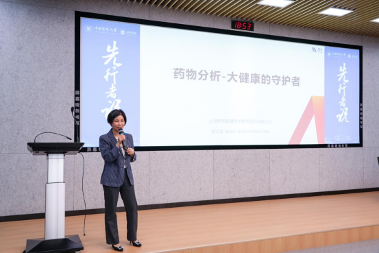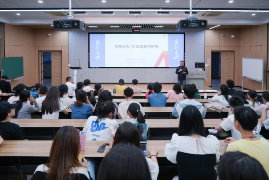 屈兰金总裁以“药物分析——大健康的守护者”为题,讲述药物分析的专业重要作用与行业发展趋势,她结合自身职业经历,分享了作为药物分析工作者的心得体会,并就药物分析如何在大健康领域发挥作用提出独到见解,为同学们提供了宝贵的行业知识,激发了探索药物分析领域的兴趣和热情。