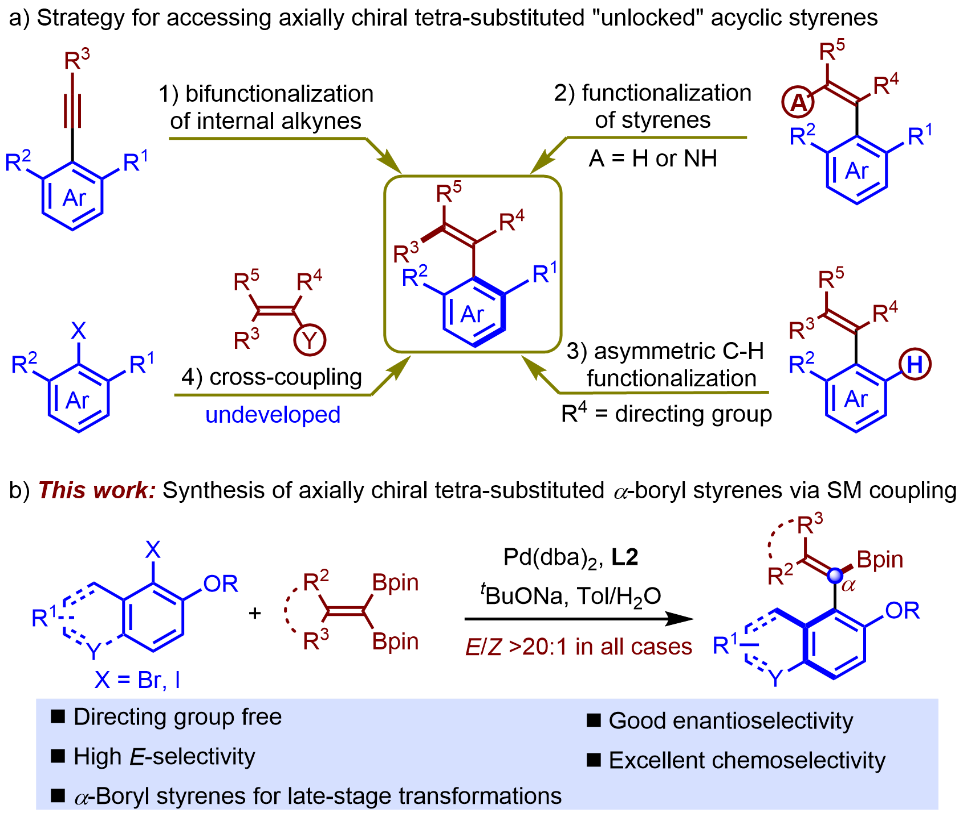 论文信息:Li X., Kong L., Yin S., et al. Palladium-Catalyzed Atroposelective Suzuki–Miyaura Coupling to Construct Axially Chiral Tetra-Substituted α-Boryl Styrenes. Adv. Sci. 2024, 11, 2309706. https://onlinelibrary.wiley.com/doi/10.1002/advs.202309706