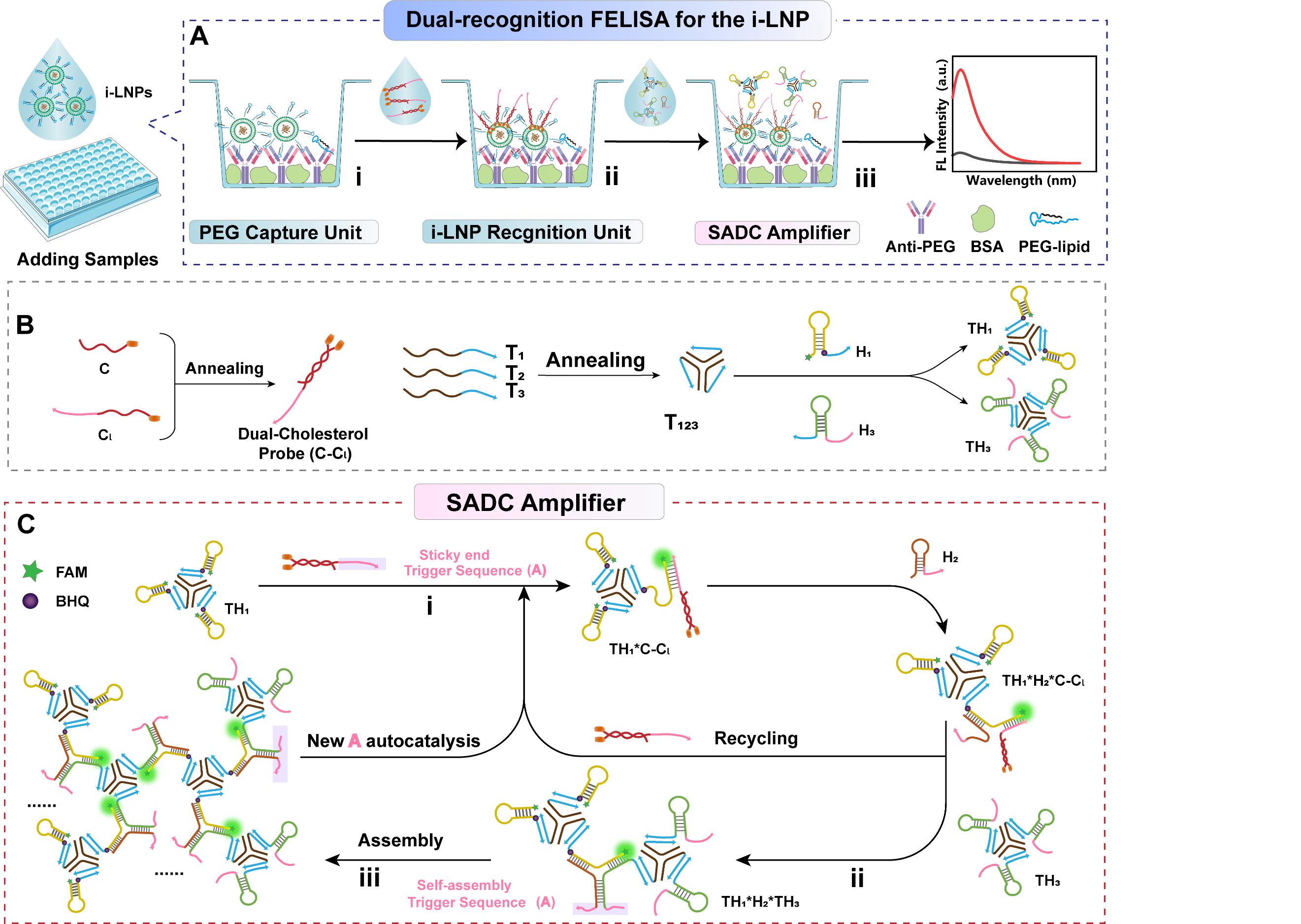 通过PEG抗体-抗原作用捕获并富集i-LNPs,避免生物脂膜干扰;再利用双胆固醇核酸探针自发锚定捕获的i-LNPs表面,将i-LNPs检测转化为探针荧光信号的检测;最后,探针的末端序列启动了局域支架自催化的DNA电路系统(SADC),从而放大了微量i-LNPs的信号。