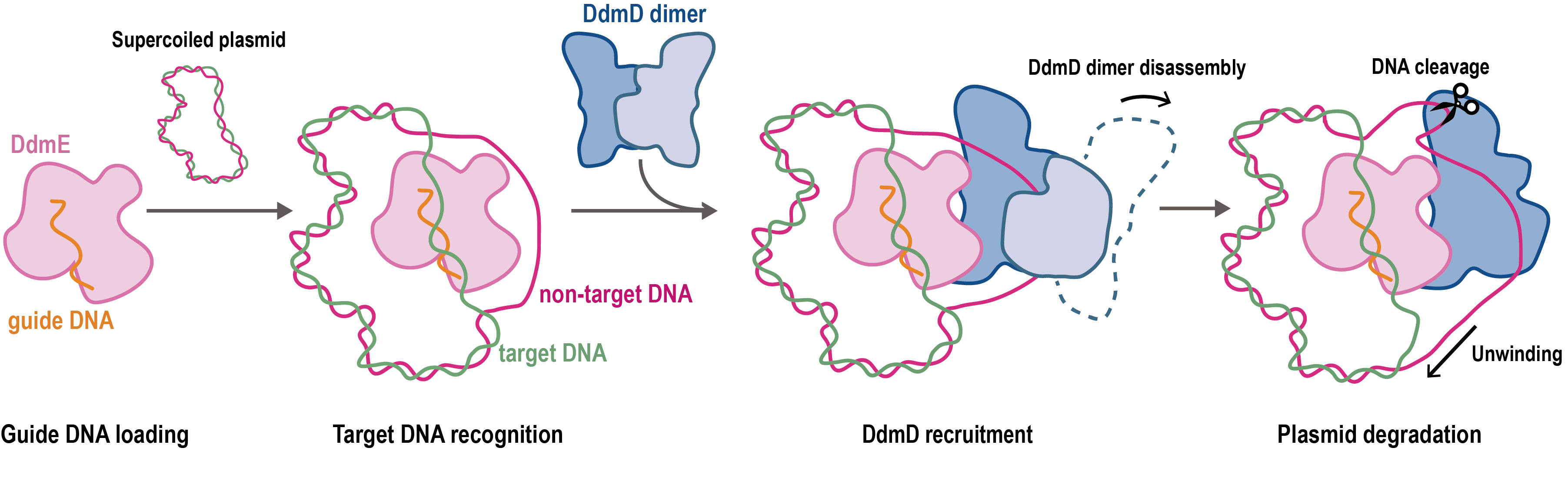 前人研究在弧菌科和乳酸菌科中发现了一种由两个基因组成的DNA防御模块DdmDE系统,该系统通过消除侵入性质粒为细菌带来适应性优势。本研究通过生化分析和结构解析揭示了乳杆菌来源DdmDE系统(LcDdmDE)的酶学功能、组装和激活机制,明确了DdmDE通过特异性识别外源DNA激活其核酸切割活性,从而阻断外源核酸的扩散。本研究为细菌如何抵御质粒入侵、限制基因水平转移提供了新的见解。DdmE在向导DNA的引导下特异性靶向互补DNA的特性以及DdmD的双链解旋和质粒切割活性使DdmDE系统用于基因编辑成为可能。