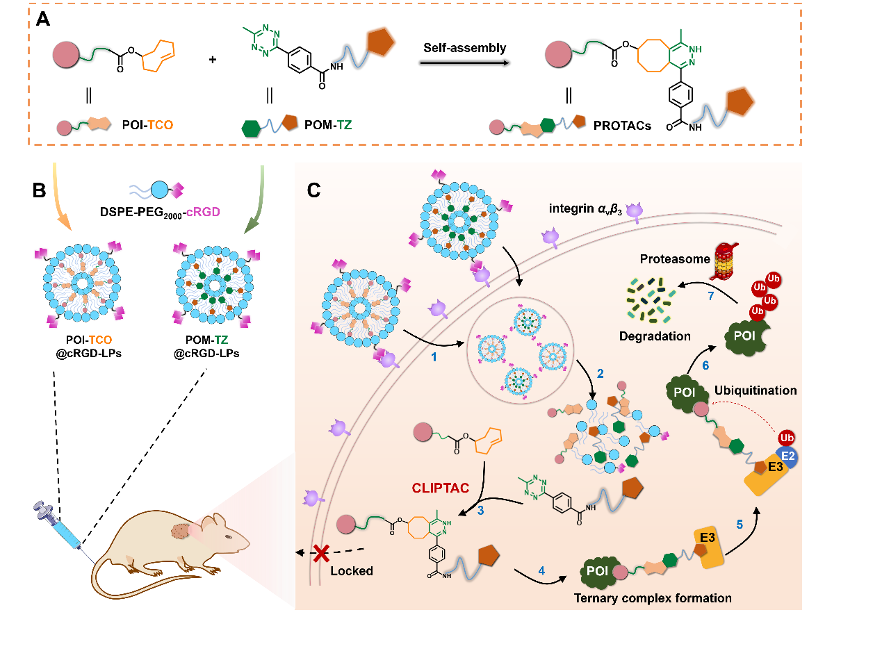 具体而言,研究团队设计合成了系列PROTACs小分子前体,通过“逆电子需求型狄尔斯–阿尔德(IEDDA)”反应,在肿瘤细胞内微环境内原位组装形成功能性 PROTACs。同时,采用修饰整合素αvβ3的脂质体靶向递送系统,分别递送PROTACs小分子前体至肿瘤区域,避免体内循环中过早反应同时提高其在肿瘤细胞内的富集效率。