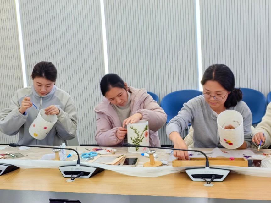活动现场,指导老师带来压花艺术文化解码课,从宫廷匠人“以花入画”的巧思传承,到现代科技对非遗技艺的创新演绎,深入浅出梳理压花艺术千年脉络。操作中,女教师们化身“春日造梦师”,在素白灯罩上自由创作,纤指翻飞间,干花细叶渐次舒展成画。