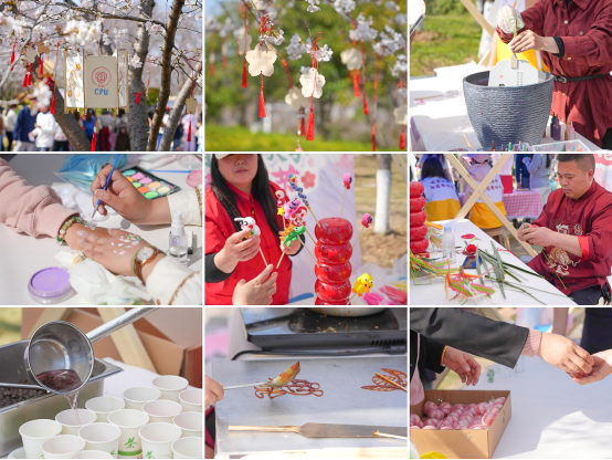 活动期间,基建后勤处策划了植物展,将1000份多肉植物与盆栽送给师生;后勤服务集团总公司举办美食展,请师生品鉴非遗糖画、非遗面人、樱花酥、樱花酿等美食;员工会提供多款樱花相关文创产品。师生员工体验非遗漆扇、草编技艺,制作中药香囊,用药学的浪漫解锁独一无二的春日气息。