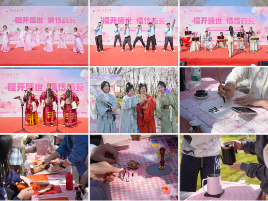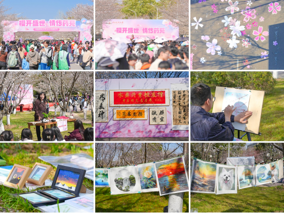 本届樱花节可谓亮点纷呈。一路生花,百余名学子共绘花路,执笔点亮地面的彩色梦想;樱花课堂,教授讲述樱花树下的思政课,传授药用植物知识;艺术长廊,员工书画展既有传统经典之作,也有现代创新之作,充分彰显了书画艺术的独特魅力。