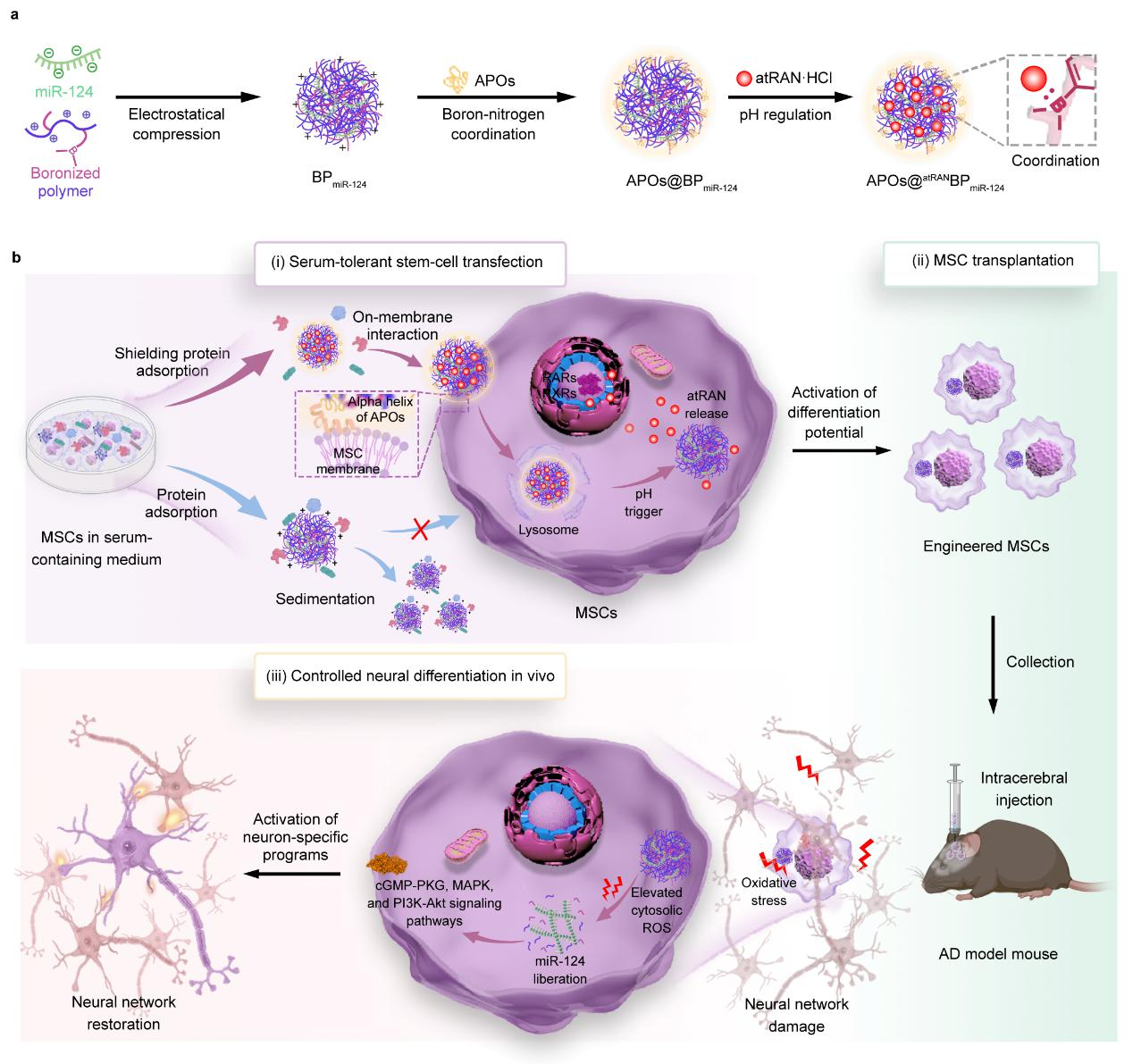 近年,围绕中枢疾病神经不可逆损伤/丢失难题,基于干细胞的神经再生疗法,通过神经定向分化和细胞网络重建,用于阿尔茨海默病(AD)等诸多神经系统退行性疾病的治疗。但其疗效仍受限于干细胞转染效率不足、细胞存活率低、神经分化难等瓶颈。为解决上述问题,该团队首次提出了一种基于内源载脂蛋白(APOs)的耐血清干细胞转染技术,联合异药双载策略,成功实现了干细胞高效神经分化。为AD等中枢系统疾病治疗提供了新思路和新方案。