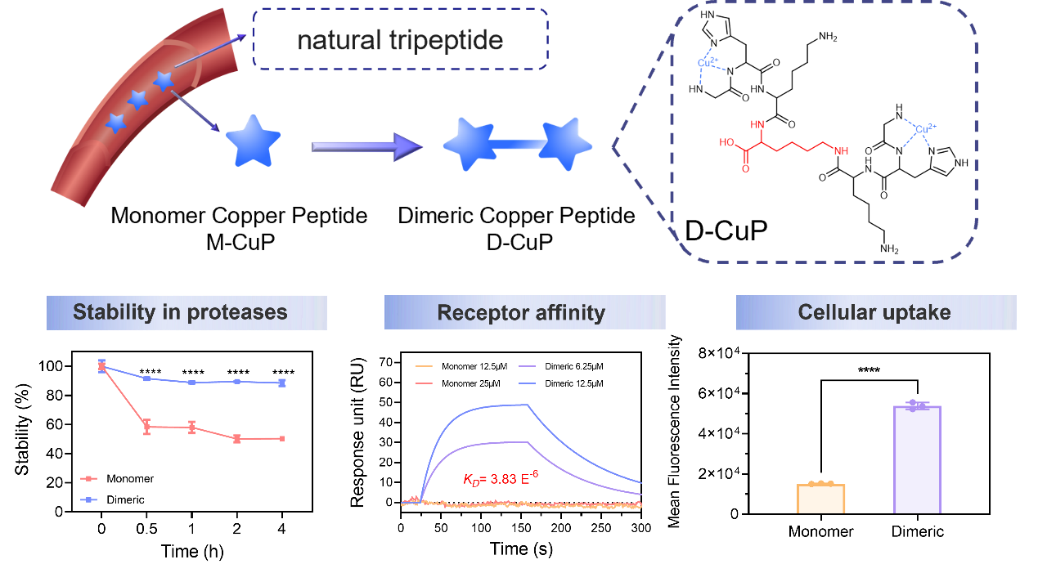 针对上述问题,涂家生/姜雷团队一直致力于新型脂质材料树状脂肽的研究,利用氨基酸为基本结构单元的树形多肽作为脂质材料的亲水基团。针对多肽分子稳定性差的问题,提出“二聚化多肽策略”,可显著提高多肽的稳定性、增强受体亲和性并诱发多价性效应,实现代谢型伤口的高效愈合。相关成果以“Dimeric Copper Peptide Incorporated Hydrogel for Promoting Diabetic Wound Healing”为题发表在权威期刊Nature Communications。2024级博士生丛瑞、2020级硕士生邓成宇与2023级硕士生李鹏伟为论文共同第一作者,bevictor伟德涂家生教授、姜雷副教授和南京大学蒋锡群教授为论文通讯作者,伟德官方网站为论文第一通讯单位。