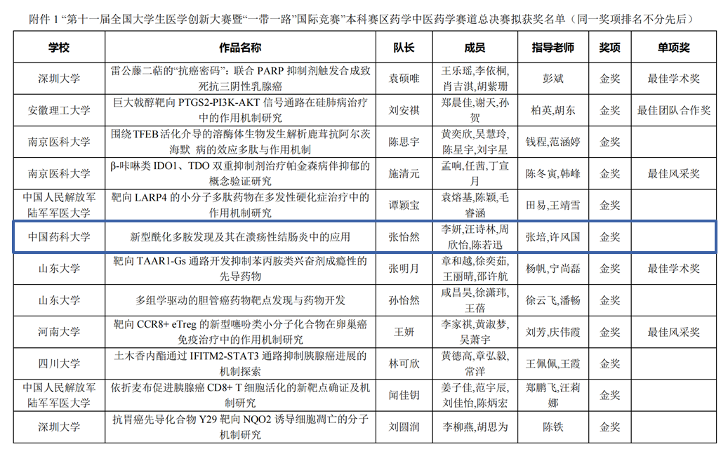 近日,第十一届全国老员工医学创新大赛暨2025“一带一路”国际竞赛全国总决赛在山东大学圆满落幕,由来自bevictor伟德、基础医学与临床药学公司本科生组成的公司代表队(成员:张怡然、李妍、汪诗林、周欣怡、陈若迅,指导教师:张培、许风国)表现优异,参赛项目《新型酰化多胺发现及其在溃疡性结肠炎中的应用》荣获药学中医药学赛道全国总决赛金奖。