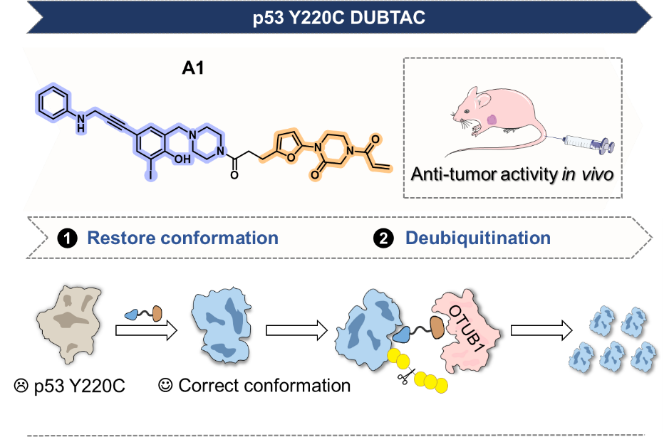 p53是关键的肿瘤抑制蛋白,由TP53基因编码,为序列特异性的DNA结合蛋白,能够调节基因转录,其Y220C突变体会导致蛋白结构失活与功能丧失,是肿瘤治疗中的重要靶点。当前,尽管小分子再激活剂Rezatapopt(PC14586)已进入临床研究,但再激活的p53蛋白仍易受泛素化介导的降解,限制其长期抑瘤效果。去泛素化靶向嵌合体(Deubiquitinase Targeting Chimeras, DUBTACs)是一类新型双功能分子,可通过招募去泛素化酶稳定靶蛋白。该研究工作首次将DUBTAC策略应用于p53 Y220C突变体,设计并合成了一系列能够同时结合p53 Y220C和去泛素化酶OTUB1的DUBTACs,使其在构象重塑p53 Y220C的同时发挥去泛素化的功能。代表化合物 A1 具有最佳上调p53 Y220C水平的作用,可特异性促进p53 Y220C的去泛素化,显著恢复其野生型构象与转录活性,从而重新激活p53通路并诱导肿瘤细胞凋亡。在Huh7异种移植瘤模型中,A1能够有效抑制肿瘤生长,该研究结果为DUBTAC技术在体内的应用提供了首个实验证据。