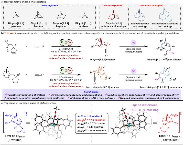目前,传统合成方法通常仅能构建单一类型的桥环骨架。因此,开发一种通用策略以实现多种桥环结构的高效构筑,具有重要科学意义与挑战性。在本研究中,研究团队设计合成了一类新型环戊烯衍生物,通过钯/铜协同催化不对称串联Heck/Sonogashira反应,成功构建了含有手性季碳与叔碳中心的炔基功能化双环[3.2.1]辛烯及苯并双环[3.2.1]辛烷骨架。进一步地,这些桥环骨架经一步立体专一的分子内环化反应,可高效转化为常规方法难以合成的复杂手性三环[5.2.1.04,8]癸二烯及苯并三环[6.2.1.04,9]十一烯桥环骨架。研究团队还通过DFT理论计算,揭示了反应手性控制的关键机制。初步生物学评价结果表明,该类手性桥环化合物展现出良好的生物活性。