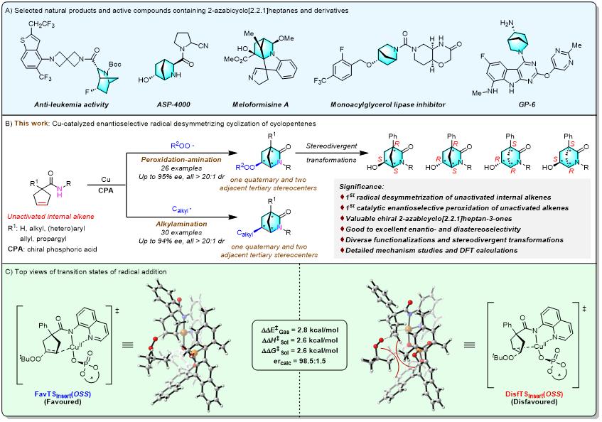 近年来,姚和权/林爱俊团队聚焦具有重要生物活性的分子片段,基于非活化烯烃双官能团化以及环化去对称化等策略,系统构建了多种手性(杂)环与高张力桥环化合物,取得了一系列重要研究成果(Angew. Chem. Int. Ed.2019, 58, 2884–2888;Nat. Commun.2020, 11, 2544;Nat. Commun.2021, 12, 6627;J. Am. Chem. Soc.2022, 144, 11364–11376;Angew. Chem. Int. Ed.2023, 62, e202211988;Angew. Chem. Int. Ed.2023, 62, e202313404; ACS Catal.2024, 14, 8739−8747;Nat. Commun. (2025). https://doi.org/10.1038/s41467-025-66363-x)。在上述工作基础上,研究团队近期开发了一种铜催化对映选择性自由基去对称化环化反应新策略,成功实现了手性过氧及烷基取代的2-氮杂双环[2.2.1]庚烷-3-酮类化合物的高效合成。该反应具有优异的对映和非对映选择性,广谱的底物适用性,灵活的结构修饰性等特点。值得注意的是,过氧取代产物可经立体发散性转化,制备多种6-羟基衍生物的立体异构体。研究团队还通过DFT理论计算,深入揭示了反应过程中手性控制的关键机制。该研究工作为手性桥环化合物的构建提供了新思路,实现了非活化内烯的对映选择性自由基双官能化,拓展了2-氮杂双环[2.2.1]庚烷类化合物的合成方法。