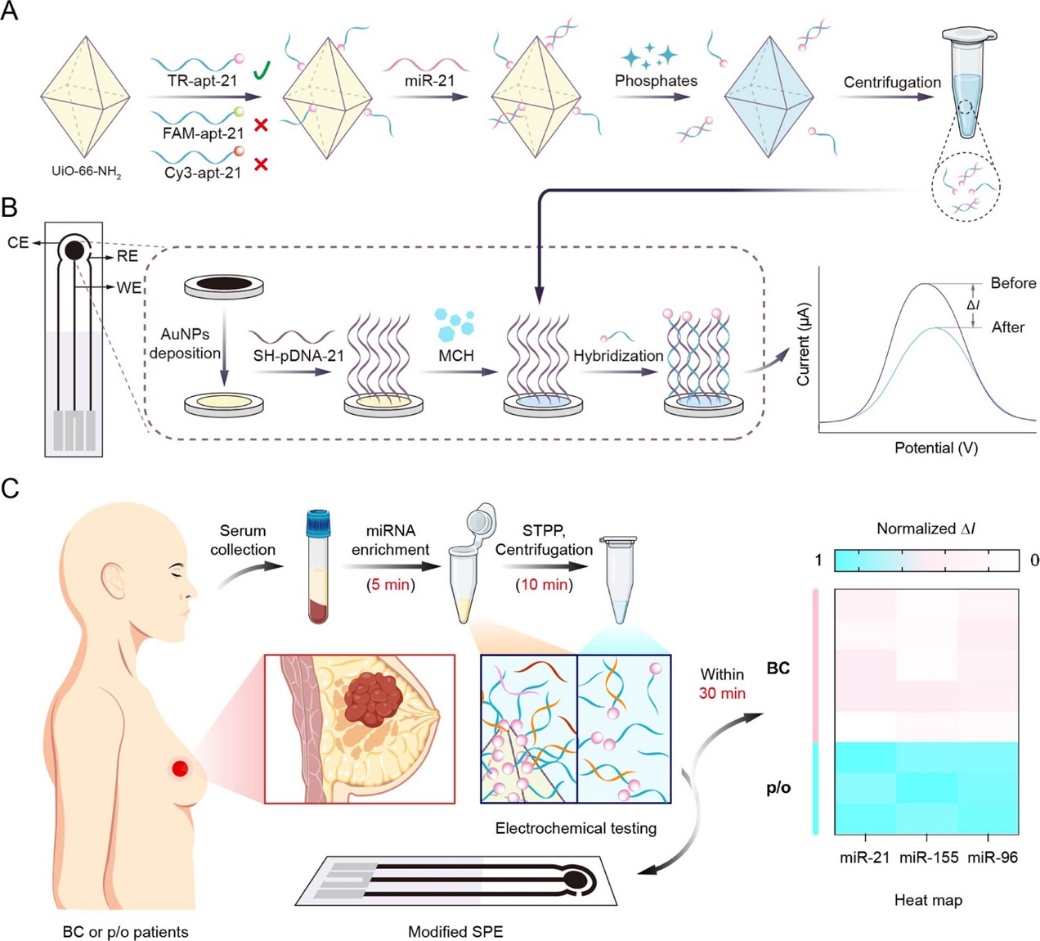该研究利用锆基MOF材料UiO 66表面丰富的Zr4+位点与Texas Red修饰的DNA适配体的特异性配位,构建了高密度捕获探针;随后利用三聚磷酸钠竞争性置换释放适配体,并结合丝网印刷电极构建的电化学传感界面,通过差分脉冲伏安法实现对目标miRNAs的定量。该方法可在45分钟内完成至少3种乳腺癌相关miRNAs(miR 21、miR 155、miR 96)的检测,能有效区分乳腺癌患者与术后康复者的血清样本。与传统的实时定量聚合酶链式反应(qPCR)方法相比,该方法具有检测速度快、成本低、无需复杂RNA提取、避免扩增产物污染等优势,为乳腺癌的早期筛查、术后监测及个性化诊疗提供了有力的技术支持。