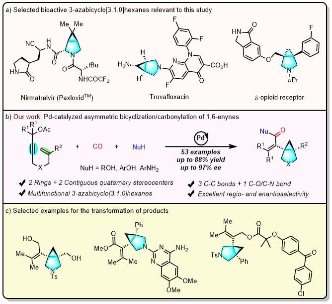 近日,国际著名期刊Angewandte Chemie International Edition(IF:16.823)在线发表了公司bevictor伟德林爱俊/姚和权团队题为“Pd-Catalyzed Asymmetric 5-exo-trig Cyclization/Cyclopropanation/Carbonylation of 1,6-Enynes for the Construction of Chiral 3-Azabicyclo[3.1.0]hexanes”最新科研成果。2020级博士研究生李秋雨和2019级硕士研究生张云初为本论文共同第一作者,林爱俊教授、姚和权教授为本文共同通讯作者,伟德官方网站为本文唯一通讯单位。