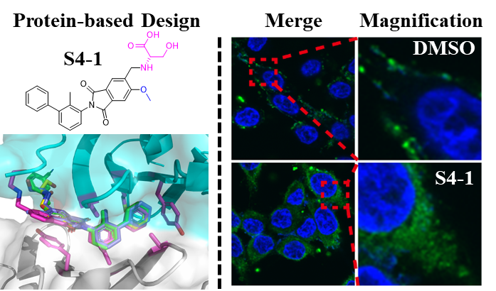 研究数据显示,S4-1可以诱导PD-L1内化到细胞质中,在内质网中富集,这可能导致随后的内质网相关降解,进一步降低PD-1/PD-L1相互作用。在结肠直肠癌模型中,S4-1抑瘤作用强,抑制率达到88.8%,25 mg/kg治疗组中部分模型鼠的肿瘤被完全清除。免疫微环境结果显示,S4-1诱导巨噬细胞的M1表型极化,预示其可能通过T细胞之外的其他免疫途径,增加抗肿瘤疗效。毒理及药代动力学研究验证S4-1安全性良好和代谢稳定。该化合物目前已获得专利授权(CN 112979532 B),为肿瘤治疗提供了全新候选药物分子。