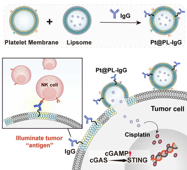 针对上述问题,本论文采用“点亮肿瘤抗原属性”(ITHAP)策略,构建生物脂质体(Pt@PL-IgG)实现肿瘤细胞的重编程,以此促进NK细胞的募集并提高NK细胞对肿瘤细胞的识别能力。在这项研究中,通过血小板膜的自主驱动,Pt@PL-IgG成功靶向肿瘤细胞,并利用膜融合特性实现NK细胞可激活靶抗原IgG在肿瘤细胞上的植入,从而显著增强肿瘤细胞的免疫可识别性。体外研究表明,生物脂质体Pt@PL-IgG能显著活化41%的NK细胞,促使NK细胞发挥ADCC效应,杀伤约47%的肿瘤细胞,并有效促进44.5%的DC细胞成熟。另外在乳腺癌、胰腺癌、Burkitt's淋巴瘤、转移性黑色瘤等动物模型中,此生物脂质体均展现出了显著的抗肿瘤作用。ITHAP策略为医药、生物及仿生递送系统领域的免疫疗法拓展新的思路与方法。