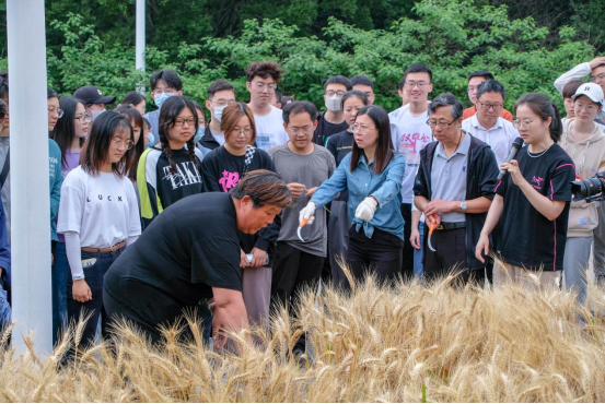 基建后勤处江海老师、陈嘉裔老师与玄武园林绿化养护老师为师生演示镰刀的使用方法和收割小麦的正确姿势,并强调安全注意事项。