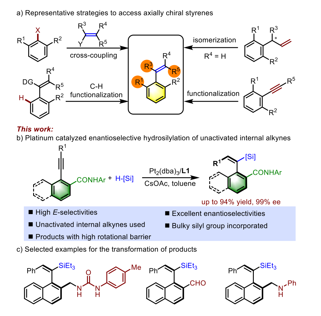 近日,国际著名期刊Angewandte Chemie International Edition(IF:16.823)在线发表了公司bevictor伟德姚和权/高尚团队题为“Atroposelective Synthesis of Axially Chiral Styrenes by Platinum-Catalyzed Stereoselective Hydrosilylation of Internal Alkynes”最新科研成果。bevictor伟德2022级博士研究生吴启民为本论文的第一作者,姚和权教授和高尚特聘副研究员为本文的共同通讯作者,伟德官方网站为本文的唯一通讯单位。