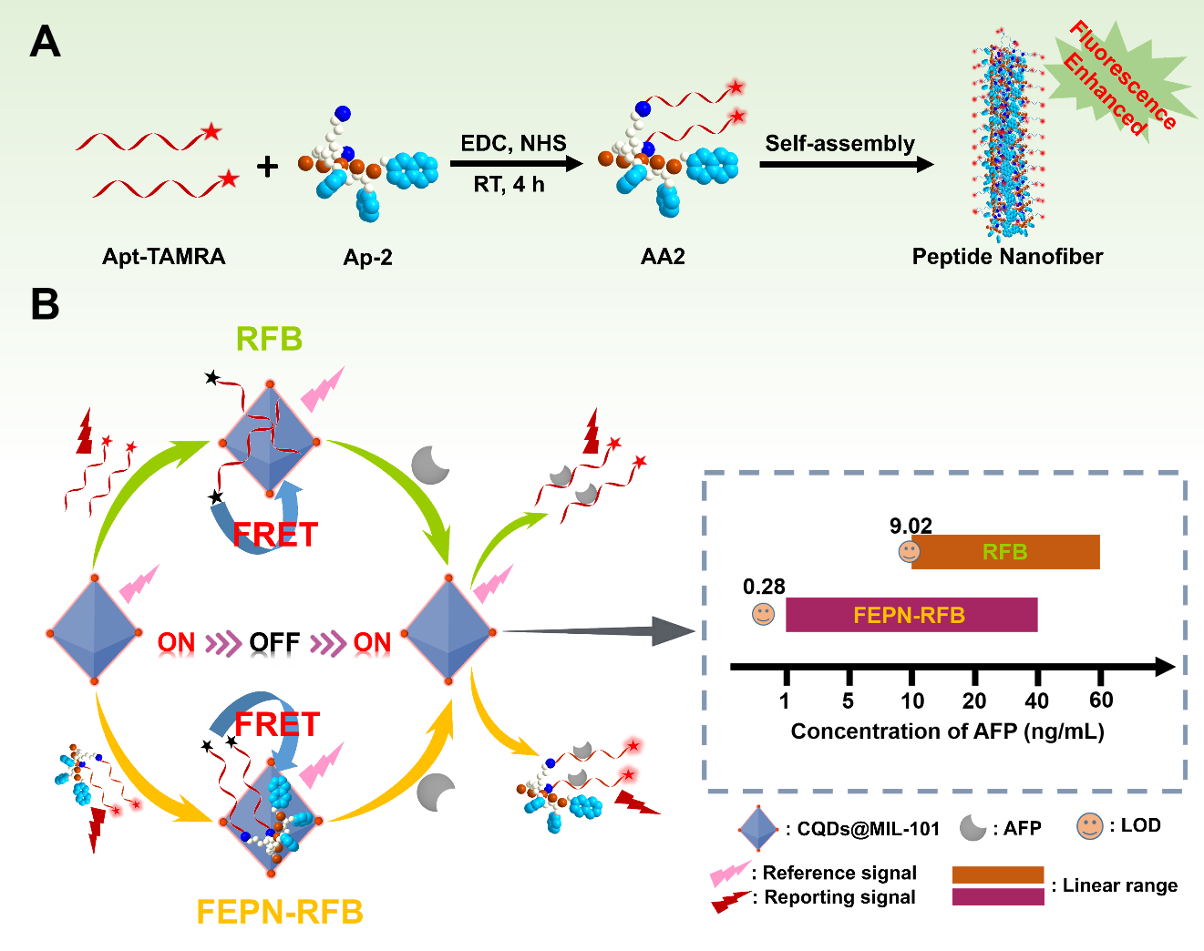 针对上述问题,研究团队开发了一种基于新型信号放大策略的比率荧光生物传感器FEPN-RFB,用于检测血清样本中的肿瘤标志物甲胎蛋白(Alpha-fetoprotein, AFP)。研究发现,两亲肽自组装形成的纳米纤维能富集Apt-TAMRA实现荧光信号放大,且两亲肽中氨基个数是影响信号放大的关键因素。为了尽量降低背景信号和系统稳定性的影响,研究人员设计了具有荧光发射和猝灭双特性的CQDs@MIL-101,其展现出优异的核酸吸附性能,由于存在荧光共振能量转移现象,可猝灭AA2的荧光。当存在目标物AFP时,AA2与AFP的强亲和力使AA2从CQDs@MIL-101表面脱离,其荧光恢复。因此,报告信号AA2与参比信号CQDs@MIL-101可形成比率荧光体系,根据AA2和CQDs@MIL-101的荧光强度可计算出AFP浓度。该生物传感器FEPN-RFB检出限达到0.28 ng/mL,与未使用新型信号放大策略相比,检出限降低了30倍。在真实血液样本的AFP检测中,FEPN-RFB与临床上使用的化学发光免疫分析法检测结果一致,展现了优良的应用潜力。该新型信号放大策略为开发具有高灵敏度的检测方法提供了思路。