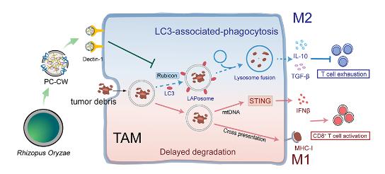 针对传统细胞毒性疗法加剧肿瘤微环境的免疫抑制的问题,姚静团队利用巨噬细胞针对入侵真菌的特异性吞噬清理机制,设计了基于米根霉孢子细胞壁(CW)的肿瘤相关巨噬细胞(TAMs)靶向仿生纳米孢子——PC-CW纳米粒,该纳米粒能够高效阻断TAMs中的LC3相关吞噬作用过程,延缓胞内肿瘤碎片的降解,从而激活一系列抗肿瘤免疫应答反应,包括提高TAMs的抗原呈递效率、激活STING通路和促进TAMs的M1型极化。最终,PC-CW能够成功地逆转和重塑肿瘤免疫微环境,并可在化疗/光热联合治疗后促进CD8+ T细胞在肿瘤中的浸润和效应激活,进而在黑色素瘤和乳腺癌小鼠模型中实现对肿瘤生长的控制和转移预防。该研究构建的生物工程型纳米孢子是一种靶向TAMs、简便通用的免疫调节策略,可实现高效的抗肿瘤免疫治疗。
