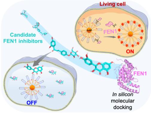 原位观察活细胞中酶活性变化对基于标志物的疾病诊断和新药筛选至关重要。Flap核酸内切酶1(FEN1)是近年来报道的一种肿瘤标志物,然而当前可用于活细胞中FEN1活性变化原位分析的方法非常有限,主要面临几个挑战,包括复杂细胞环境干扰检测特异性、方法易引入背景信号等。该团队在前期研究基础上,构建了一种基于纳米金载体的DNA荧光传感器,其可以特异性响应活细胞中FEN1的活性变化,并以简单添加到细胞培养基中的方式实现“传感器输入,结果输出”。利用计算机分子对接和验证实验,该研究还探索了将其用于快速筛选FEN1潜在抑制剂的能力,为针对该靶点的化合物活性评价提供了一种有力的分析手段。