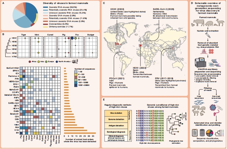 示意图:养殖哺乳动物中病毒的流行病学和遗传多样性