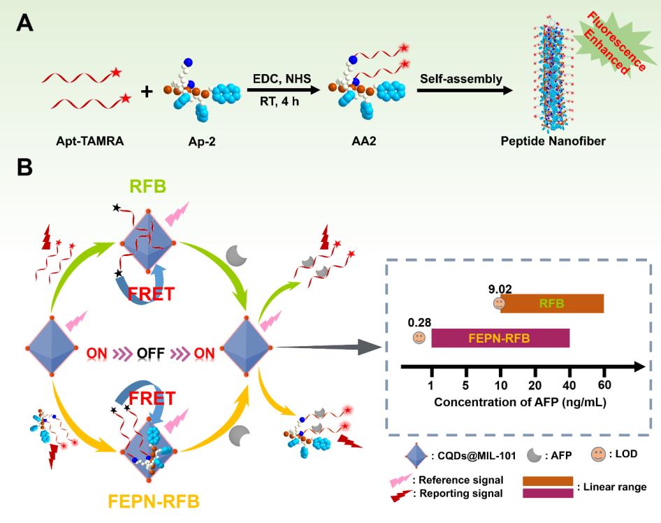 为了实现癌症的早期诊断,研究团队开发了一种基于新型信号放大策略的比率荧光生物传感器FEPN-RFB,用于检测肿瘤标志物甲胎蛋白(Alpha-fetoprotein, AFP)。研究发现,两亲肽自组装形成的纳米纤维能富集Apt-TAMRA实现荧光信号放大。同时,具有荧光发射和猝灭双特性CQDs@MIL-101的设计能降低背景信号和系统稳定性的影响。该生物传感器FEPN-RFB检出限达到0.28 ng/mL,与未使用新型信号放大策略相比,检出限降低了30倍。本研究首次创新性实现基于自组装两亲肽的信号放大,为开发具有高灵敏度的检测方法提供了思路。近年来,研究团队在人畜共患疾病和药物残留等方向的快速检测领域开展系列研究工作,并取得了一些研究成果。