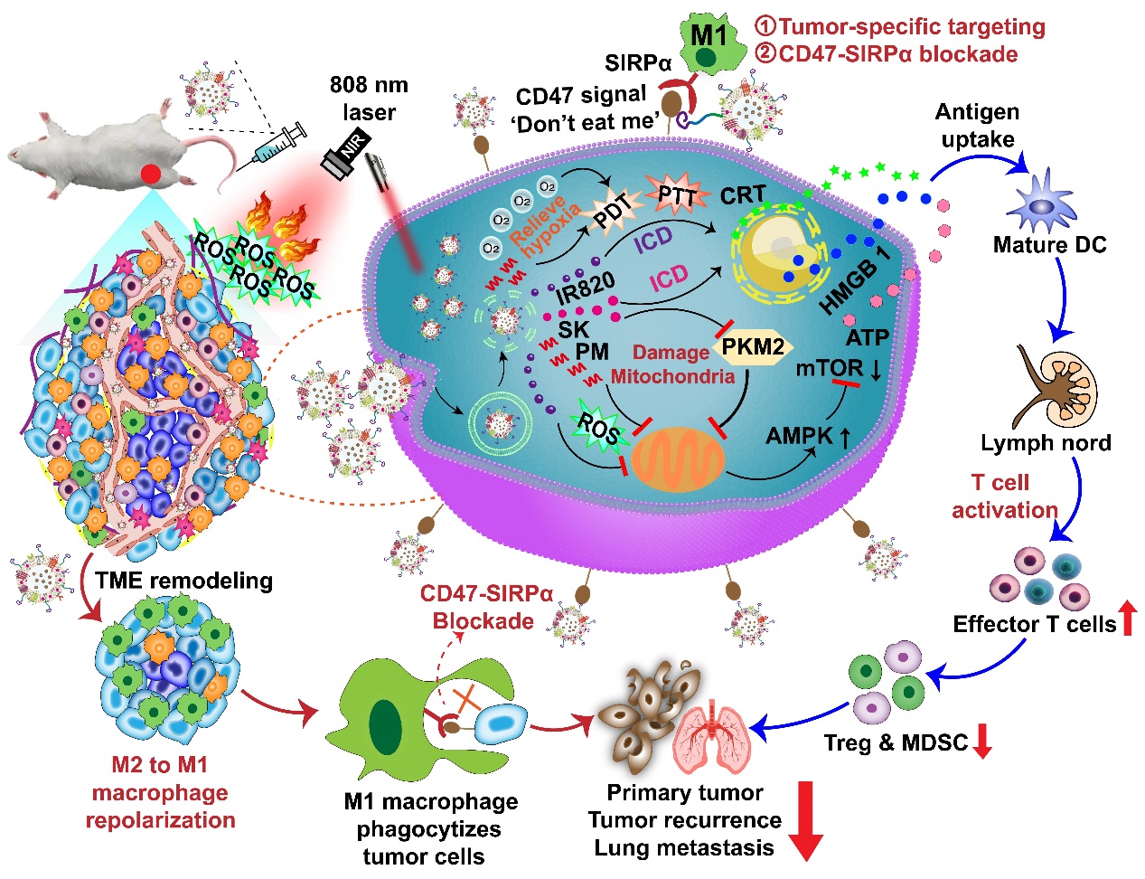 免疫检查点阻断疗法(ICBT)已成为一种具有巨大发展潜力的肿瘤免疫疗法,但ICBT仍存在临床响应性低等局限性,因为肿瘤微环境严重削弱了ICBT对免疫学“冷”肿瘤的治疗效果。“冷”肿瘤微环境中缺乏细胞毒T细胞的瘤内浸润,含有大量具有促肿瘤生长作用的巨噬细胞、抗炎细胞因子和免疫抑制细胞(如调节性T细胞、髓源性抑制细胞等),导致无效的抗肿瘤免疫治疗。肿瘤相关巨噬细胞(TAMs)是浸润到肿瘤组织中最丰富的免疫细胞,在调节抗肿瘤免疫方面发挥关键作用。TAMs能分化成两种相反功能的表型,一种是促炎杀肿瘤的M1表型,另一种是抗炎促肿瘤的M2表型。M1型TAMs是典型的活化巨噬细胞,其具有肿瘤抑制能力,而M2型TAMs具有促肿瘤作用而导致肿瘤发展和免疫抑制。TAMs具有可塑性,促肿瘤的M2型TAMs能够被极化为抗肿瘤的M1型TAMs,这有助于将“冷”肿瘤微环境转变为“热”肿瘤微环境,从而进行有效的肿瘤免疫治疗。然而,仅依靠M1型TAMs对肿瘤细胞的吞噬还不足以诱导有效的肿瘤抑制,因为其吞噬功能经常会被肿瘤细胞释放的“别吃我”信号所阻碍。肿瘤细胞表面过表达的CD47分子可与巨噬细胞表面的SIRP𝛼受体结合,使得肿瘤细胞发出“别吃我”信号而逃避巨噬细胞吞噬。因此,阻断CD47-SIRP𝛼轴和重塑TAMs为抗肿瘤表型是两种增强肿瘤免疫治疗的有效手段。