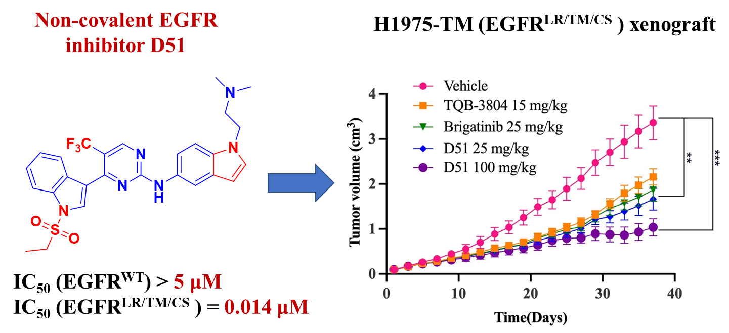 该团队发现,尽管携带EGFR三突变的患者获得了对奥希替尼的抗性,但奥希替尼在体外对EGFR三突变体表现出一定的抑制活性。因此,基于奥希替尼与靶蛋白的共晶结构,提出通过环化策略增加化合物与突变体之间的相互作用,成功设计并合成一系列化合物,该类新型化合物在体外酶活和细胞抗增殖活性中表现出强效的抑制作用。优选化合物D51作为一种非共价的、强效、高选择性的第四代EGFR抑制剂,它可以有效抑制 EGFRL858R/T790M/C797S突变体,同时保留野生型EGFR活性。动物实验显示,化合物D51可以显著抑制携带EGFRL858R/T790M/C797S的非小细胞肺癌肿瘤的发展,并且在体内具有良好的安全性。该研究提供了一种强效的第四代EGFR抑制剂,为治疗奥希替尼耐药的NSCLC提供了潜在的候选化合物。
