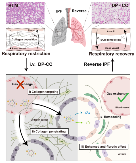 In view of the characteristics of excessive deposition of pathological collagen under pulmonary fibrosis condition, a collagen targeting and penetrating nano-platform was constructed to deliver drugs in injured sites and reverse fibrosis. Collagen targeting peptide was used to target pathological collagen in the lungs, and collagenase was added to degrade collagen, so that drugs could reach the deep of alveoli to treat pulmonary fibrosis. The study was published in Journal of Controlled Release and was featured as Outside Front Cover. And the title of the study is Pathological collagen targeting and penetrating liposomes for idiopathic pulmonary fibrosis therapy. Master's degree candidate Ming-Yuan Yang and Master's degree holder Yi-Jun Lin are the co-first authors of this paper. China Pharmaceutical University is the only corresponding address.