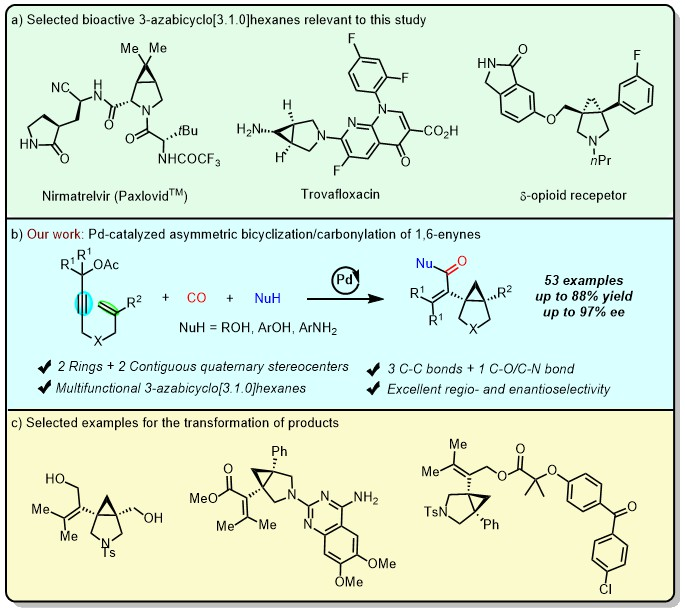 Transition metal-catalyzed carbonylation of unsaturated C-C bond with carbon monoxide (CO) is a widely adopted method for accessing functionalized carbonyl compounds. It has been implemented as a key step in the synthesis of natural products and pharmaceuticals. Recently, remarkable progress has been achieved in asymmetric tandem Heck carbonylation. However, they are all initiated from ArX (Csp2-X), and the tandem cyclic carbonylation reaction initiated from propargylic acetate (Csp3-X) remains in its infancy. Yao and Lin’s team disclose a mild and efficient access to chiral 3-azabicyclo[3.1.0]hexanes via a Pd-catalyzed asymmetric 5-exo-trig cyclization/cyclopropanation/carbonylation of 1,6-enynes (Figure 1, b). To demonstrate the synthetic utility of current protocol, various transformation of the products into more structurally diverse 3-azabicyclo[3.1.0]hexane derivatives were conducted (Figure 1, c). This developed 1,6-enynes bicyclization/carbonylation reaction along with the downstream chemistry efficiently enable fast diversification of aza-[3.1.0]bicycle-based building blocks, which is hoped to facilitate their application in drug discovery.