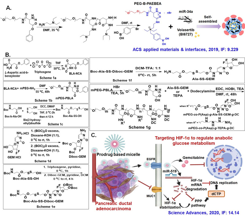 (1) Desmoplastic and hypoxic pancreatic cancer microenvironment induces aberrant expression of miRNAs and hypoxia-inducible factor-1 (HIF-1α) responsible for gemcitabine (GEM) resistance. We demonstrated that miR-519c was down-regulated in pancreatic cancer and transfection of miR-519c in GEM-resistant pancreatic cancer cells inhibited HIF-1α level under hypoxia. We synthesized redox-sensitive mPEG-co-P(Asp)-g-DC-g-S-S-GEM polymer, with GEM payload of 14% (w/w) and 90% GEM release upon incubation with l-glutathione. We synthesized mPEGco-P(Asp)-g-TEPA-g-DC for complex formation with miRNA. Chemical modification of miR-519c with 2′-O-methylphosphorothioate (OMe-PS) at 3′ end enhanced its stability and activity without being immunogenic. Epidermal growth factor receptor targeting peptide GE11 decoration increased tumor accumulation of micelles after systemic administration and significantly inhibited orthotopic desmoplastic pancreatic cancer growth in NSG mice by down-regulating HIF-1α and genes responsible for glucose uptake and cancer cell metabolism. Our multifunctional nanomedicine of GEM and OMe-PS–miR-519c offers a novel therapeutic strategy to treat desmoplasia and hypoxia-induced chemoresistance in pancreatic cancer.