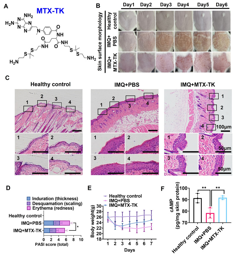 (3) Oxidative stress, nuclear factor kappa-light-chain-enhancer of activated B cells (NF-κB) and adenosine signaling are factors associated with the psoriatic inflammation. Topical delivery of methotrexate (MTX) has become an option to overcome the side effects caused by systemic therapy in psoriasis, leading to the suppression of NF-κB activation through boosting adenosine release. However, the thickened psoriatic skin is the primary restriction against the local drug delivery. The nanoassemblies-loaded microneedle arrays were capable of significantly penetrating the imiquimod-induced psoriatic epidermis in mice. The efficient topical delivery of these nanoassemblies was achieved by potent mechanical strength and hyaluronic acid as the dissolvable matrix for microneedle arrays. CD44-mediated endocytosis enabled the intracellular uptake of nanoassemblies in keratinocytes, and methotrexate was released from MTX-TK-HA with ROS stimuli, followed by suppressing the proliferation of epidermal cells via NF-κB pathway blockade. In psoriatic mouse model, nanoassemblies loaded microneedle arrays relieved the inflammatory skin disorders via regulation of adenosine and NF-κB signaling. Our study offered a rational design for the transdermal delivery of hydrophobic agents and defined an effective therapeutic option for psoriasis treatment.