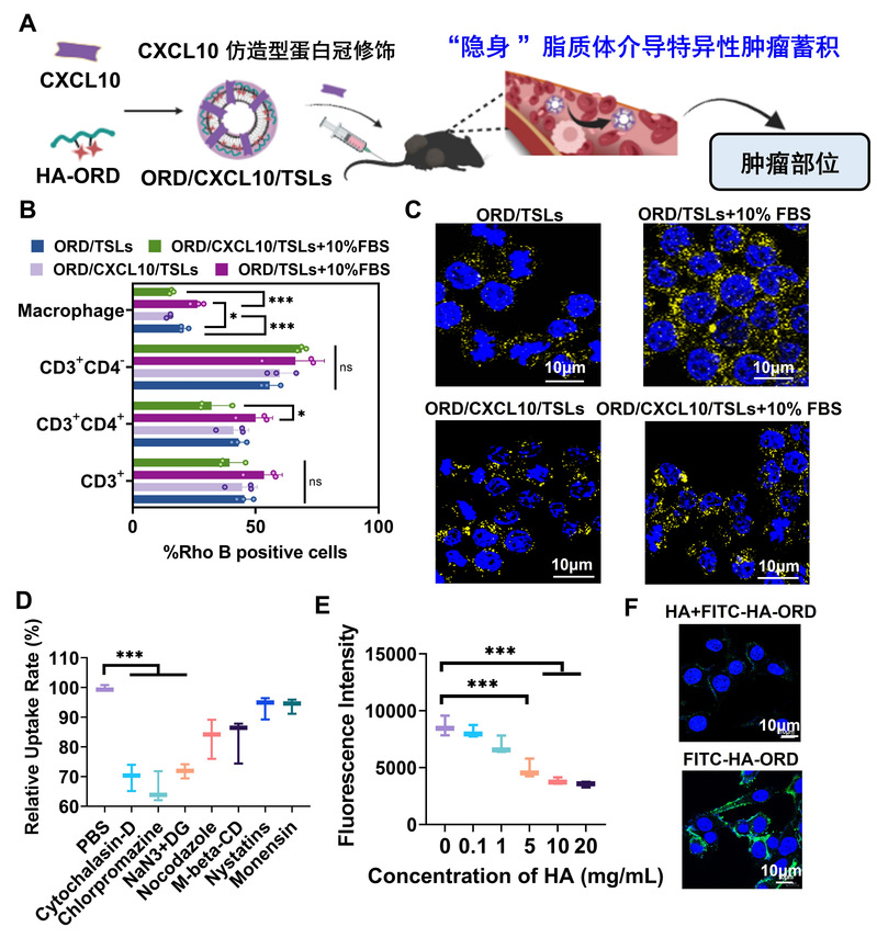 (2) The interplay of liposome-protein corona hinders the clinical application of liposomes due to active macrophage sequestration and rapid plasma clearance. Here we showed that, CXCL10 as a therapeutic protein was coronated the thermosensitive liposomes to form stealth-like nanocarriers (CXCL10/TSLs). Decoration of the corona layer of CXCL10/TSLs by hyaluronic acid conjugated oridonin (ORD/CXCL10/TSLs), overcame the “fluid barrier” built by biological proteins, drastically reduced capture by leukocytes in whole blood, allowed the specific targeting of tumor sites. Multifunctional medicine ORD/CXCL10/TSLs with hyperthermia drove the sustained cytokine-CXCL10 inflammatory loop to switch macrophage phenotype to M1-like, expand tumor-infiltrating natural killer cells and induce intratumoral levels of interferon-γ. Oridonin synergized with CXCL10 during ORD/CXCL10/TSLs treatment, downregulated PI3K/AKT and Raf/MEK signaling for M1-like polarization and migration inhibition. Furthermore, ORD/CXCL10/TSLs potently synergized with anti-PD-L1 antibody in mice bearing metastatic melanoma, induced sustained immunological memory and controlled metastatic spread.