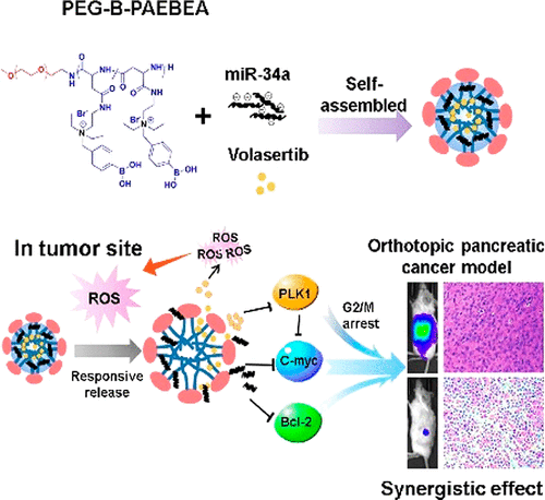 (1)Ineffective drug delivery and poor prognosis are two major challenges in the treatment of pancreatic ductal adenocarcinoma (PDAC). While there is significant downregulation of tumor suppressor microRNA-34a (miR-34a), which targets many oncogenes related to proliferation, apoptosis, and invasion, high expression level of Polo-like kinase 1 (PLK1) is closely associated with short survival rates of pancreatic cancer patients. Therefore, the objective is to codeliver miR-34a mimic and small molecule PLK1 inhibitor volasertib using poly(ethylene glycol)-poly[aspartamidoethyl(p-boronobenzyl)diethylammonium bromide]. This polymer could self-assemble into micelles of ∼100 nm with 10% drug loading of volasertib and form a complex with miR-34a at the N/P ratio of 18 and higher. Combination treatment of volasertib and miR-34a displayed the synergistic effect and superior antiproliferative activity along with an enhanced G2/M phase arrest and suppression of colony formation, leading to cell death due to potential c-myc targeting therapeutics. Orthotopic pancreatic tumor bearing NSG mice were scanned for fluorescence by IVIS after systemic administration of micelles encapsulating volasertib and miR-34a. There was significant reduction in tumor volume, and histological examination of major organs suggested negligible systemic toxicity. In conclusion, PEG-B-PAEBEA micelles carrying volasertib and miR-34a mimic have the potential to treat pancreatic cancer.
