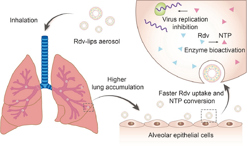 (2)Strong infectivity enables coronavirus disease 2019 (COVID-19) to rage throughout the world. Remdesivir is one of the most promising anti-severe acute respiratory syndrome coronavirus 2 (SARS-CoV-2) drugs. We developed lyophilized remdesivir liposomes (Rdv-lips) which can be reconstituted as liposomal aerosol for pulmonary delivery to improve the in vivo behavior of existing remdesivir cyclodextrin conclusion compound (Rdv-cyc) injections. The in vitro liposomal aerosol characterization demonstrated that Rdv-lips possessed a mass median aerodynamic diameter of 4.118 µm and fine particle fraction (<5 µm) higher than 50%, indicating good pulmonary delivery properties. Compared to the Rdv-cyc intravenous injection group, the Rdv-lips inhalation group displayed a nearly 100-fold increase in the remdesivir-active metabolite nucleotide triphosphate (NTP) concentration and better NTP accumulation in the lung than the Rdv-cyc inhalation group. A faster transition from remdesivir to NTP of Rdv-lips (inhalation) could also be observed due to better cell uptake. Compared to other preparations, the superiority of Rdv-lips was further evidenced by the results of an in vivo safety study, with little possibility of inducing inflammation. In conclusion, Rdv-lips for pulmonary delivery will be a potent formulation to improve the in vivo behavior of remdesivir and exert better therapeutic effects in COVID-19 treatment.
