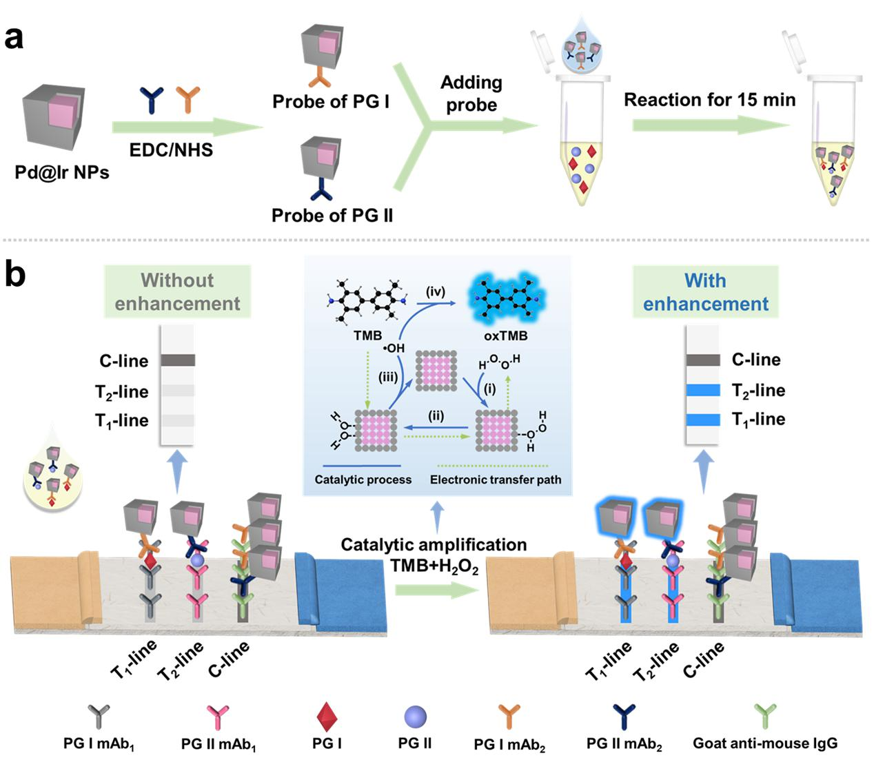 To address these issues, the research team employs a colourimetric signal amplification strategy, i.e., bimetallic nanozyme-mediated in situ-catalyzed reporter deposition (BN-ISCRD), for LFIA to achieve ultrasensitive detection of cancer biomarkers. Due to the synergistic or additive effect of the two metals, the bimetallic nanoenzymes (Pd@Ir NPs) exhibit superior peroxidase-like activities than Pd NPs and Ir NPs. Based on this, they are taken as labelling materials for LFIA by in situ catalytic reporter molecule deposition in order to achieve the amplification of colorimetric signals and enhance the detection sensitivity. The method is applied to the detection of gastric cancer markers (PG I and PG II), and the naked-eye detection limit is up to 10 pg/mL after signal amplification, providing a 200-fold sensitivity. In parallel, 8 gastric cancer-positive samples have been successfully identified from 36 clinical serum samples, in line with the detection results of the clinical method. This BN-ISCRD strategy combines novel nanomaterials with biosensing technology to introduce a new approach for building an ultrasensitive and instantaneous detection platform.