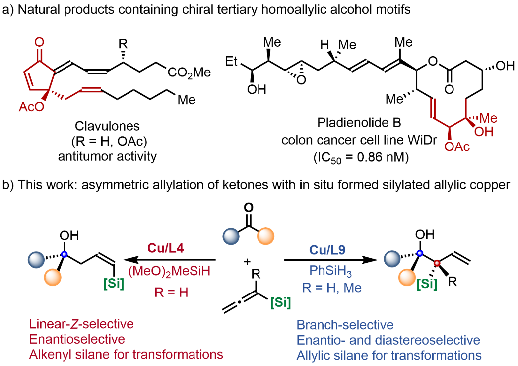 In recent years, targeting the construction of molecular fragments and building blocks of bioactive drugs, Prof. Yao and Gao’s team has designed and synthesized a variety of chiral molecular skeletons through transition-metal-catalyzed hydrofunctionalization and other strategies. They have achieved several important research results (J. Am. Chem. Soc. 2022, 144, 11364-11376; Angew. Chem. Int. Ed. 2023, 62, e202305518). Based on this, the team has recently designed and developed a copper-catalyzed enantioselective and regiodivergent allylation of ketones with allenylsilanes. In this study, high regioselective and enantioselective syntheses of branched tertiary homoallylic alcohols as well as linear-Z-type products have been achieved by using different chiral ligands, respectively. In addition, through the palladium catalyzed double bond isomerization strategy, the linear-Z-products can be smoothly converted into the linear-E-products. Alkenylsilane or allylsilane fragments in the products can directly participate in various transformations, enriching the structural diversity of the products quickly and efficiently.