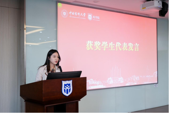 bevictor伟德2020级药学专业的徐郑皆乐代表获奖员工发言,感谢阿普塔集团的资助以及bevictor伟德领导和老师的辛勤付出,表示今后将以扎实的学习、不懈的努力和持续的创新回报公司和企业的培养,同时表达了将志存高远、锐意进取,将个人价值的实现融入医药强国、守护人民健康实践中。