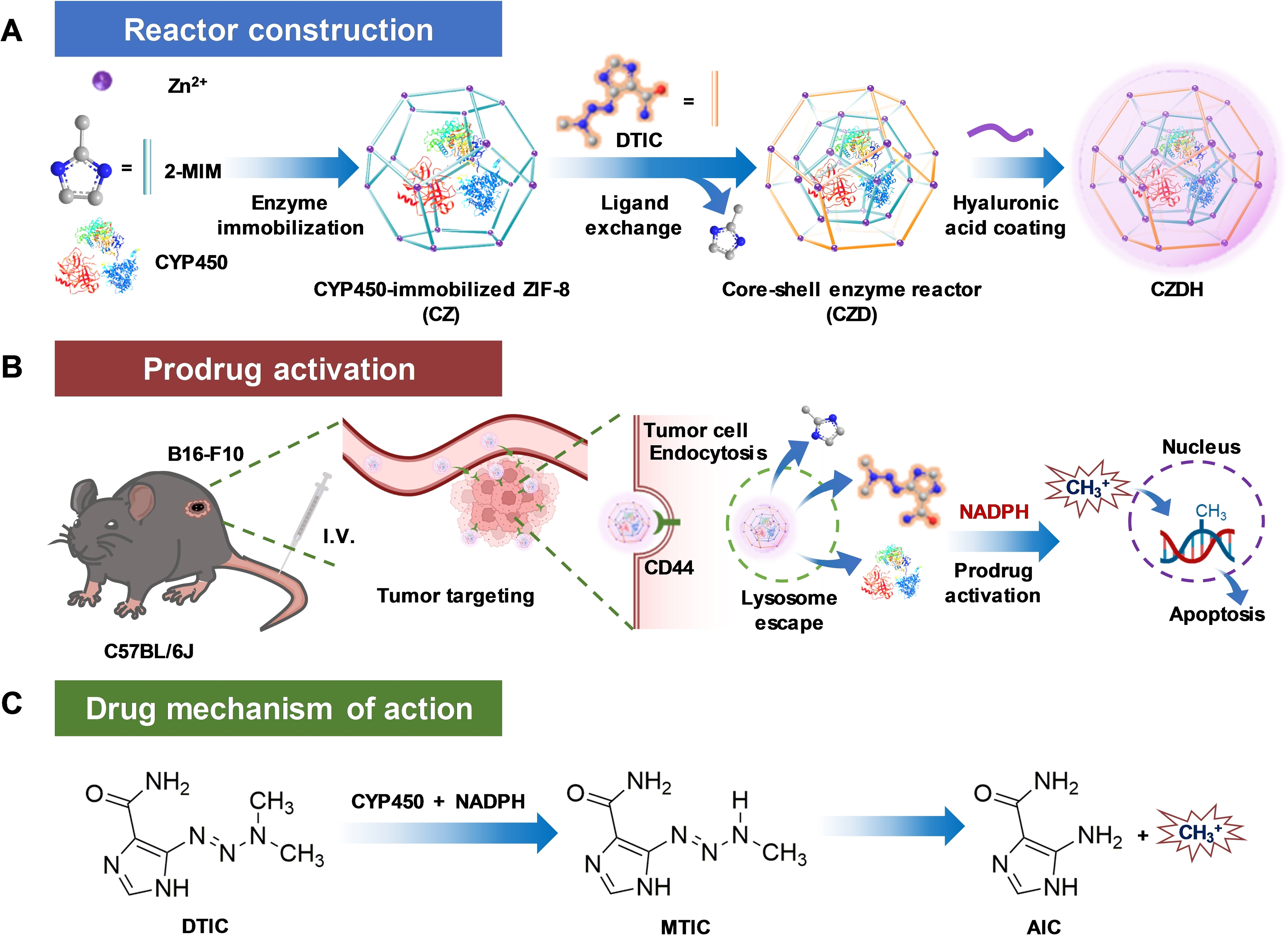 本文提出利用沸石咪唑骨架-8(ZIF-8)构建具有核—壳结构的酶反应器。CYP450固定在ZIF-8内核中;抗肿瘤药物达卡巴嗪(DTIC)作为有机配体,通过配位作用沉积在外壳层。这种特殊的核—壳结构,将酶和其底物整合在同一体系中,确保其体内分布的一致性。一方面对CYP450结构起到保护作用,另一方面将DTIC的载药量提升至约43.6%。实验结果显示,该反应器仅在肿瘤细胞内高浓度烟酰胺腺嘌呤二核苷酸磷酸(NADPH)条件下发生前药激活反应,显著提高了酶催化反应的细胞选择性。酶催化反应将DTIC转化为甲基阳离子,诱导DNA甲基化和肿瘤细胞凋亡。借助透明质酸的肿瘤靶向能力,该核—壳酶反应器显示出96.6%的肿瘤抑制率,未观察到明显毒副作用。该工作为体内生物催化的有效性、选择性和安全性提供了一种简单而通用的策略。