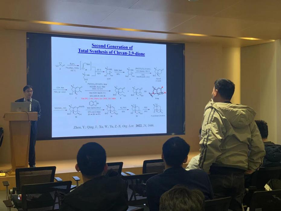报告中,余志祥教授介绍了课题组发展的[5+2+1], [7+1], [4+2+1], [5+2], [4+3], [3+2+1], [4+2], [5+1], [3+2], [4+1]等一系列成环反应,并将其中的一些反应应用于天然产物的合成。利用计算化学为主要手段研究反应机理,然后基于机理设计新反应,并通过实验进行验证和发展。提问环节中,bevictor伟德杨鹏教授、林爱俊教授、高尚教授以及与会员工都与余教授进行了课题问题的探讨。余教授与在场师生积极互动,耐心细致地答疑,公司师生们均获益匪浅。