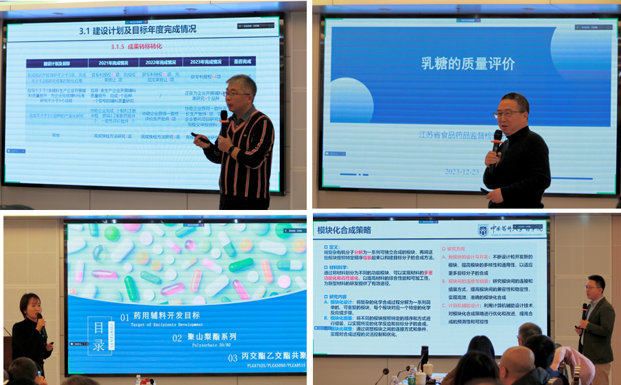 随后,孙春萌教授作重点实验室工作报告,详细介绍了重点实验室2023年建设情况及三年期建设目标完成情况;江苏省食品药品检验监督研究院检验技术研究室主任袁耀佐、南京威尔药业集团研究院(江苏省水溶性药用辅料工程技术研究中心)副经理王娅、伟德官方网站药剂系副教授何东升分别就各单位研究进展进行主题报告。